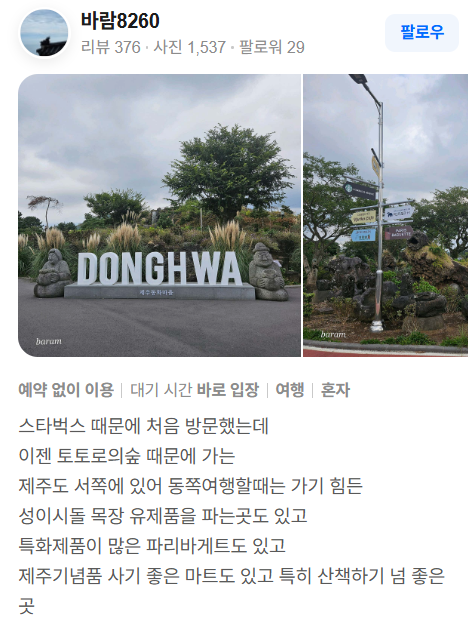 • 공원 내에는 카페(예: 스타벅스 더제주 송당 파크 R점), 굿즈샵(예: 지브리 굿즈 ‘도토리숲 제주점), 관광마트(예: 제스코 관광마트) 등이 들어서 있어 식사·쇼핑·체험까지 한 번에 해결할 수 있는 복합 관광 공간입니다.