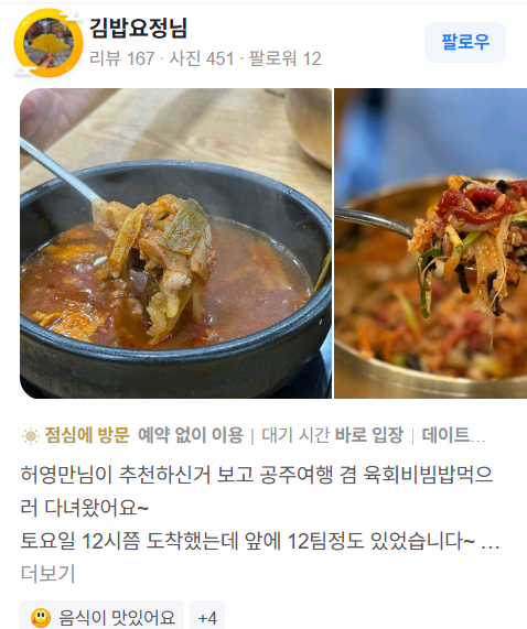 공주를 여행하거나 공산성 일대를 둘러볼 계획이라면 시장정육점식당의 알밤육회비빔밥은 반드시 리스트에 올려야 할 맛집입니다. 맛, 분위기, 지역 특색 모두 잡은 곳이기 때문에 여행 만족도를 높여줄 수 있는 선택지입니다.