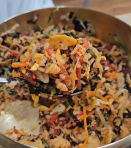 육회비빔밥에 쓰이는 고기는 국내산 한우 암소이며, 육회 맛이 신선하고 깔끔하다는 평이 많음.