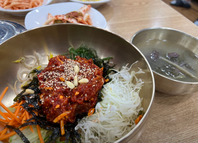 육회비빔밥에 달큰한 알밤이 들어가 특별한 식감을 선사하며, 함께 제공되는 선지해장국도 된장 베이스로 깔끔한 맛이 일품입니다.