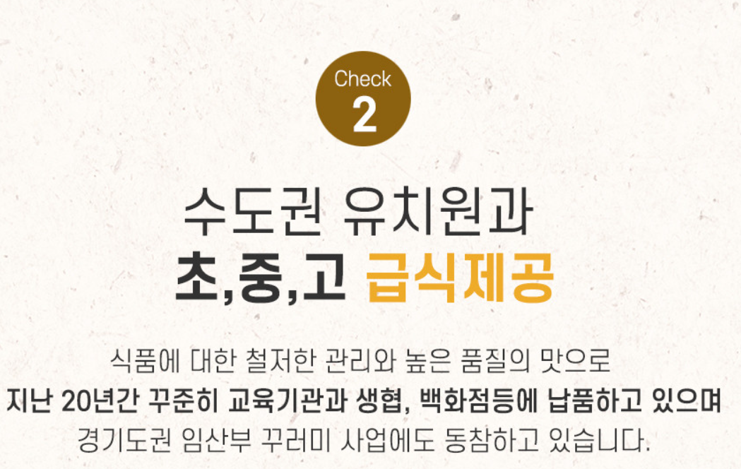 경기도 급식, 임산부 꾸러미, 유치원, 생협(자연드림) 등 다양한 기관 및 기업에 지속적으로 공급하고 있습니다.