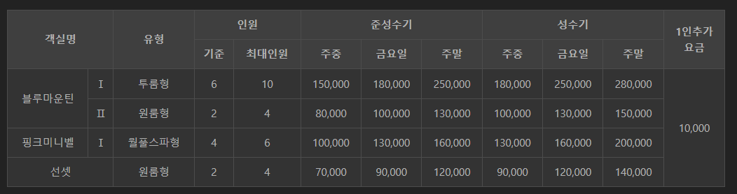 객실명특징 및 요금 안내
