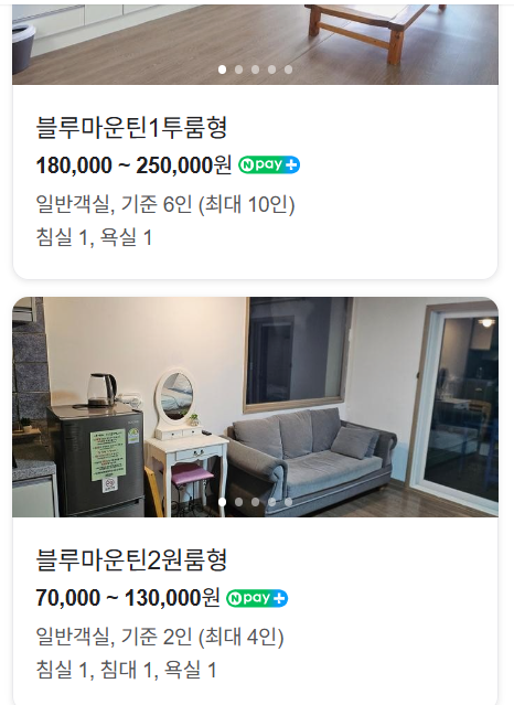 블루마운틴Ⅱ 원룸형 2~4인 기준, 금연 객실, 체크인 15:00 / 체크아웃 11:00 기준, 요금 약 80,000원대