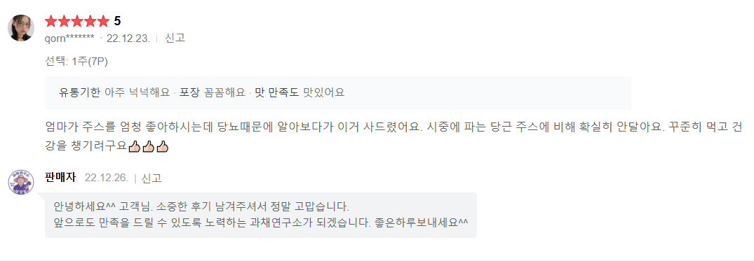 - 과채연구소 자색당근주스 선물세트(20P)의 경우, SSG몰 상품 페이지에서 별점 5.0 / 5.0을 받은 후기가 있습니다.