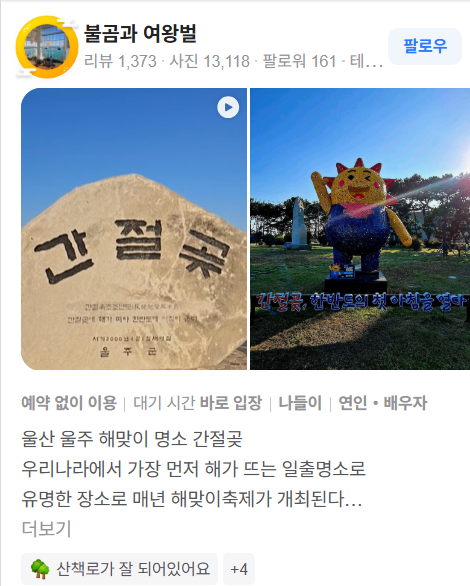 • 간절곶은 동해안에서 새해 첫 해를 가장 먼저 맞이할 수 있는 상징적 장소이며, 일출 + 바다 풍경 + 조형물 등이 어우러져 깊은 인상과 여운을 주는 여행지