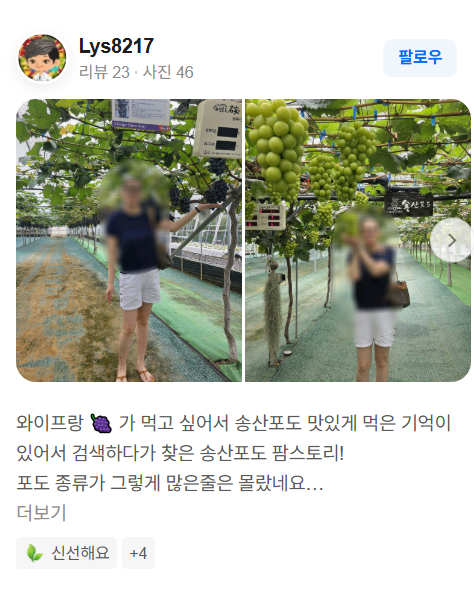 송산포도팜스토리는 단순한 농장이 아니라 자연, 체험, 품질, 교육이 어우러진 공간으로서, 포도를 좋아하는 분들, 아이들과 함께 추억을 만들고 싶은 가족, 농업·품종에 관심 있는 분들에게 매우 추천드립니다.