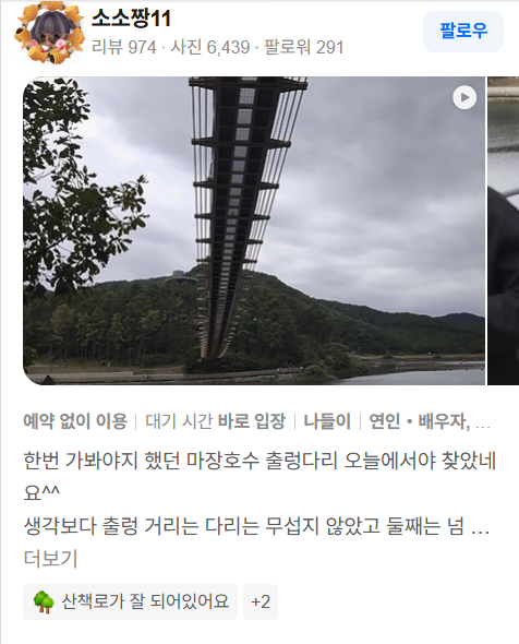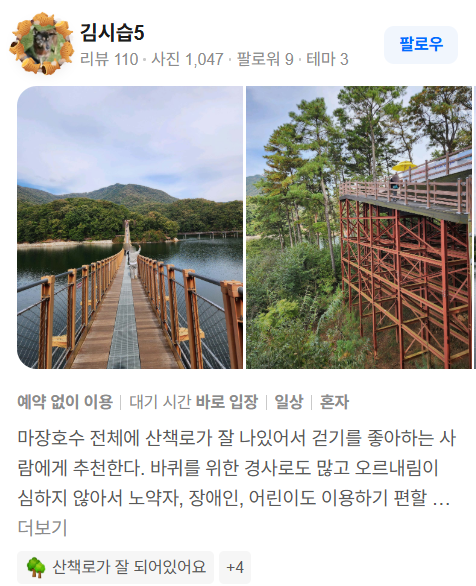 마장호수 출렁다리는 “호수 위를 걷는 듯한” 특별한 체험과 더불어, 자연이 주는 고요함과 계절마다 변화하는 풍경까지 모두 갖춘 매력적인 장소입니다.