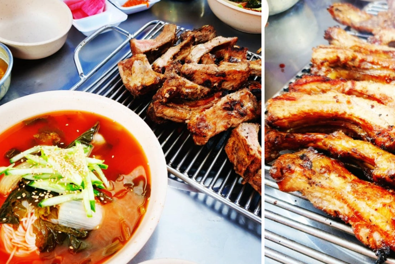 - “등갈비 구이 냄새가 장터 전체에 퍼져서 아주 먹음직스럽다.” — 먹거리 중 하나가 등갈비 구이임.