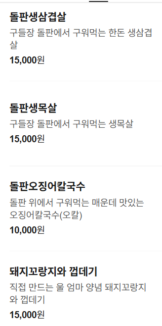- 돌판 생목살: 삼겹살 외에 목살을 돌판에서 구워 먹는 메뉴로, 부드럽고 풍미 있는 고기를 선호하는 분께 추천됩니다.