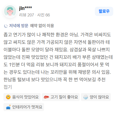 - “성수 길거리 지나가다 우연히 발견했는데 진짜 미친 고깃집… 돌판구이 방식이 신선했어요.”