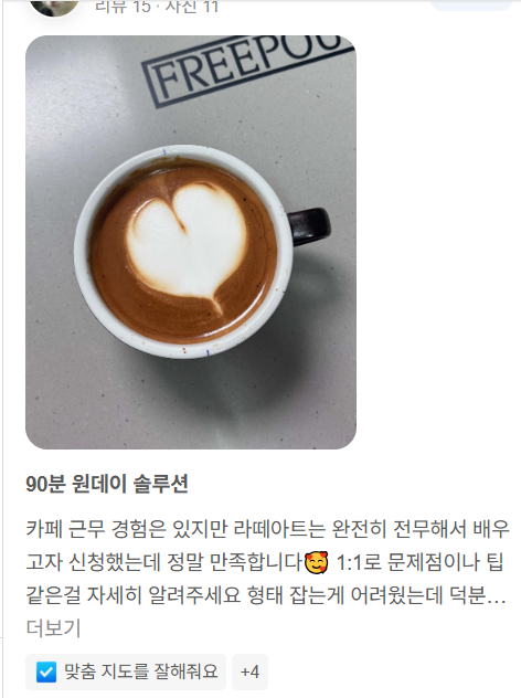 🔹 “1:1 클래스가 효과적이다”, “바리스타 경험 없어도 친절히 가르쳐 준다”는 긍정적 의견이 SNS에 자주 공유됩니다.