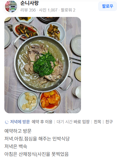리뷰를 보면 알 수 있듯이, 산마을민박식당은 단순히 숙박이 아니라 사람 냄새 나는 따뜻한 경험을 제공합니다.