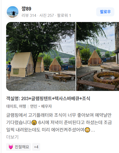 • ⩗ 숙소 가격 텐트+바베큐+조식 포함