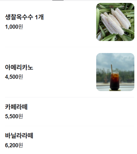- 커피 & 음료류: 아메리카노, 라떼, 계절 음료 (예: 옥수수 라떼 / 옥수수 우유 / 달콤한 옥수수 스무디 등)
