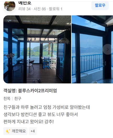 - “탁 트인 거실과 시원한 바다전망이 감탄을 자아냈다” – 오션뷰가 훌륭했으며, 분위기가 매우 인상적이라는 리뷰가 많습니다.