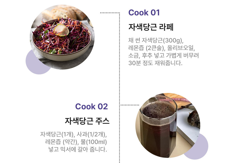 - 보라색은 안토시아닌, 폴리페놀 등 강력한 항산화물질이 풍부하다는 증거입니다.