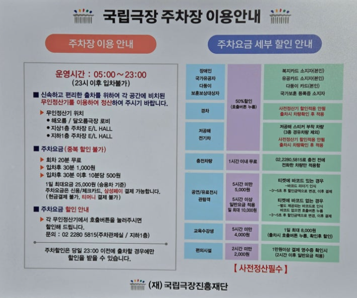 - 예약 필요성: 특히 석식 이용 시 예약 필요. 공연 일정과 연동하여 운영 시간이 바뀔 수 있으므로 사전 전화문의 추천 (02-2280-5843)